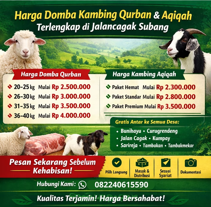 Dengan memilih layanan harga domba kambing qurban dan aqiqah terlengkap di Jalancagak Subang, Anda tidak hanya mendapatkan hewan terbaik, tapi juga layanan profesional yang memudahkan ibadah Anda.